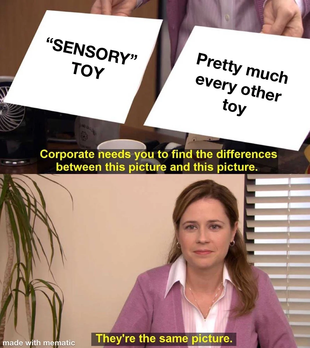 I’m not going to make you scroll further before I cut to the chase: EVERYTHING IS INHERENTLY “SENSORY,” so it’s easy (but meaningless) to use the term to generate buzz. Our brains are constantly taking in the sensory stimuli around us; right now I’m sitting on my couch (feeling the weight of my body sinking into it), hearing the baby monitor’s white noise and the automatic cat water fountain, with the lights somewhat dimmed but the glow of my laptop screen), feeling the click of the keys as my fingers press them, and sipping my lemon-flavored sparkling water. My sensory system is in balance right now in this environment, but that would not be true for a lot of people. Does that make my living room a Sensory room? Of course not, but if I marketed it as such, who could really stop me? It is, after all, TECHNICALLY a sensory experience.